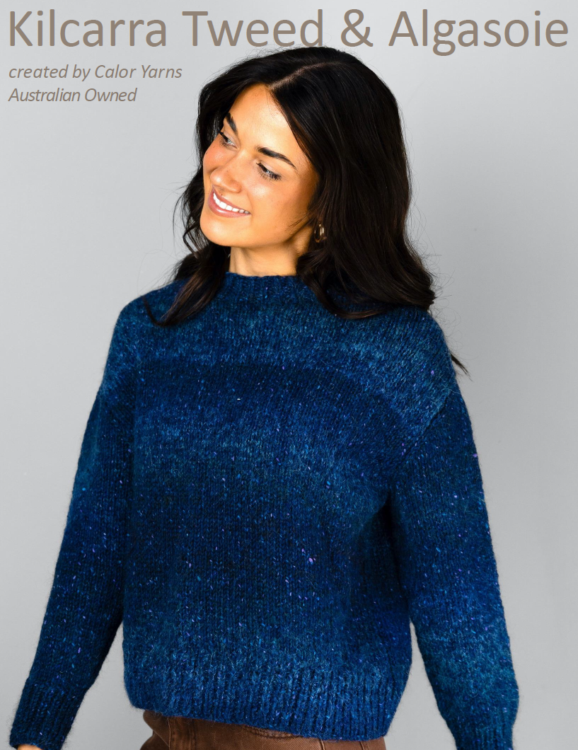 Driftline Sweater pattern shown in Kilcarra Tweed Crolly (1745) and Algasoie Deep Reef (08) colours.