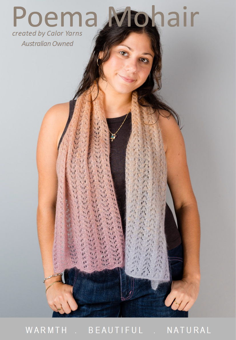 Petal Scarf pattern shown in Petals (04) colour. 70% Kid Mohair, 30% Silk blend Poema Mohair yarn. Suits 3.50mm knitting needles.