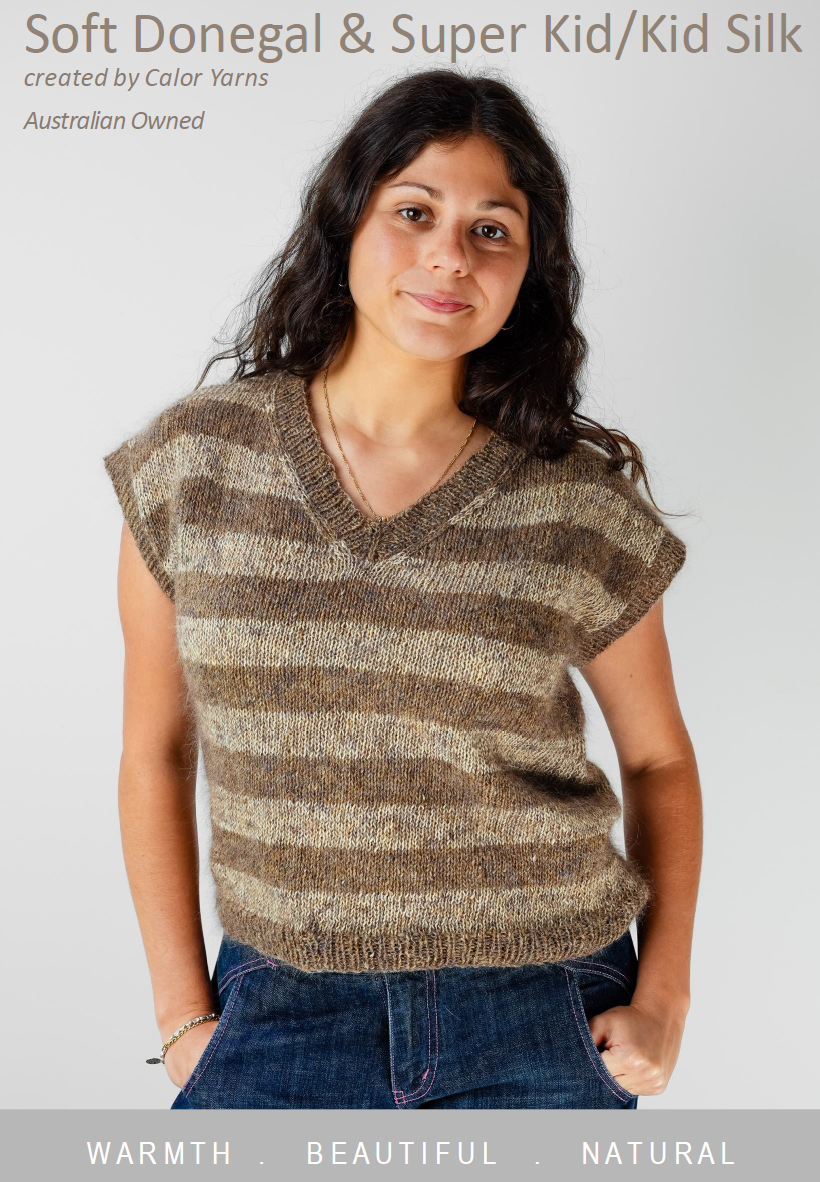 Valley Vest pattern shown in Soft Donegal Boyne (5518) and Swilly (5507) colours, and Super Kid Walnut (07) colours. [Easy Knitting]