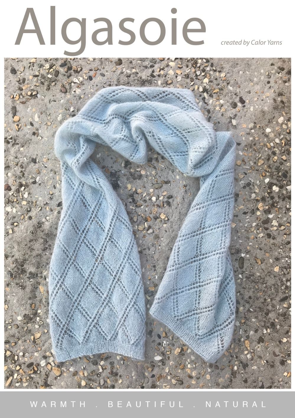 Diamond Scarf pattern shown in Pale Blue (20) colour. 70% Alpaca Wool, 30% Silk blend Algasoie yarn. Suits 3.50mm needles.
